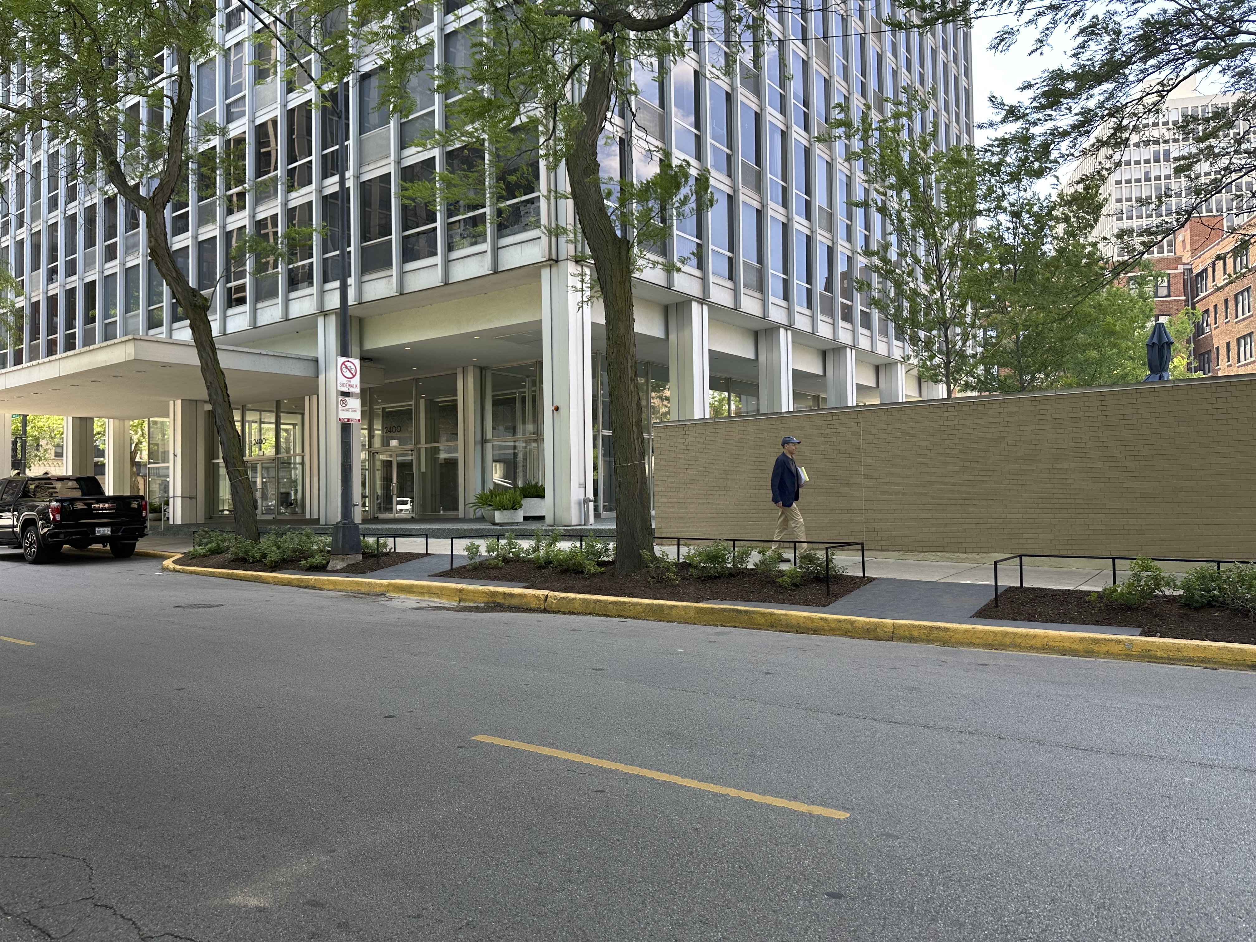 Our parkway landscape redesign at Mies's 2400 N Lakeview sees its first weekend. We removed the 3 foot wide concrete walk ways and elevated the experience with flame finished absolute black granite pavers from Tom van Etten at Galloy & Van Etten set in a running bond pattern five feet wide by Alan C. Watkins of Clarence Davids who also spruced up our plantings with additional sumac and new mulch.