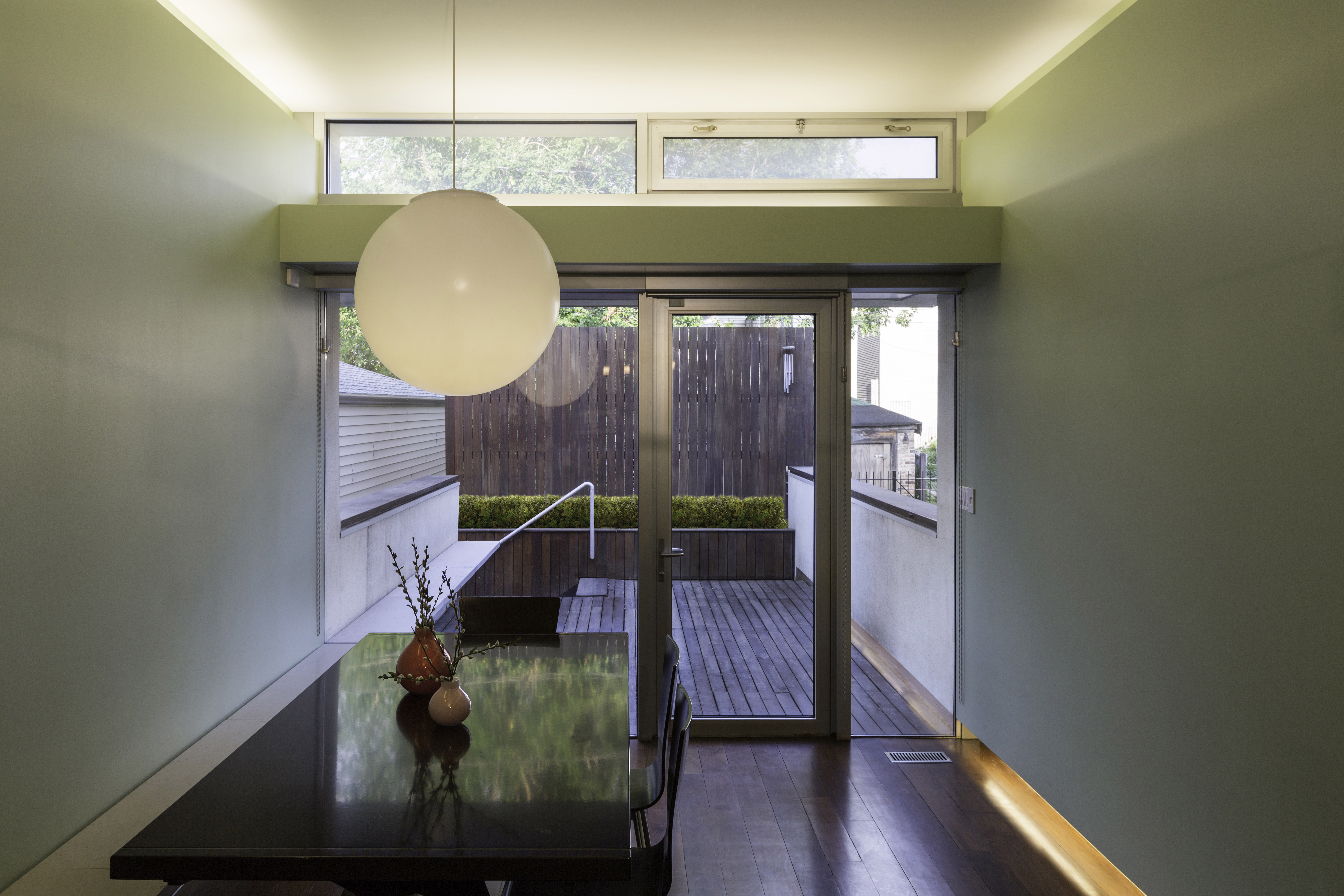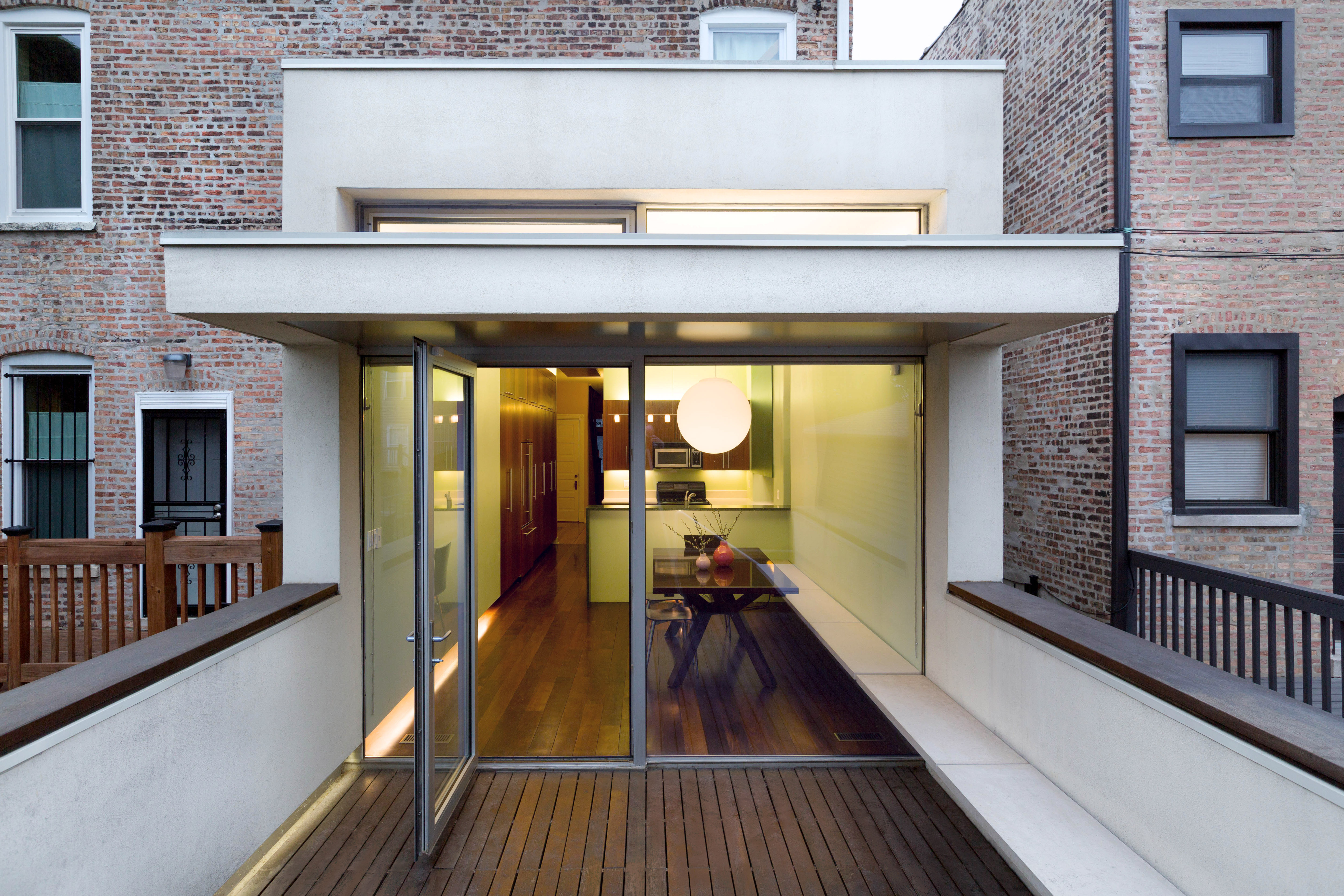 This attached, masonry row house sits on an eighteen-foot wide lot in Chicago's Grand Boulevard, a neighborhood notable for its rapid genesis from an open field into a dense, beautiful, upper-middle-class neighborhood in the 1880s. Luxurious and new at the time of the nearby Columbian Exposition, the building, four decades later, was crudely divided into apartments during the Great Depression. A contractor had recently restored its single occupancy but cut the rear off from light and air. In his defense, the yard was not much to look at: a gravel and dirt pad. We set out to create an inside/outside space employing effects with light, color and material that would create a volume for family, community and mindfulness.